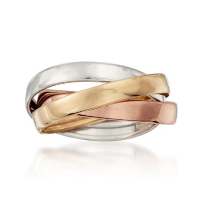 Shiny and sleek connected bands of white, yellow and rose gold square measure tangled during this pretty rolling ring. Adds a unchanged, h...
